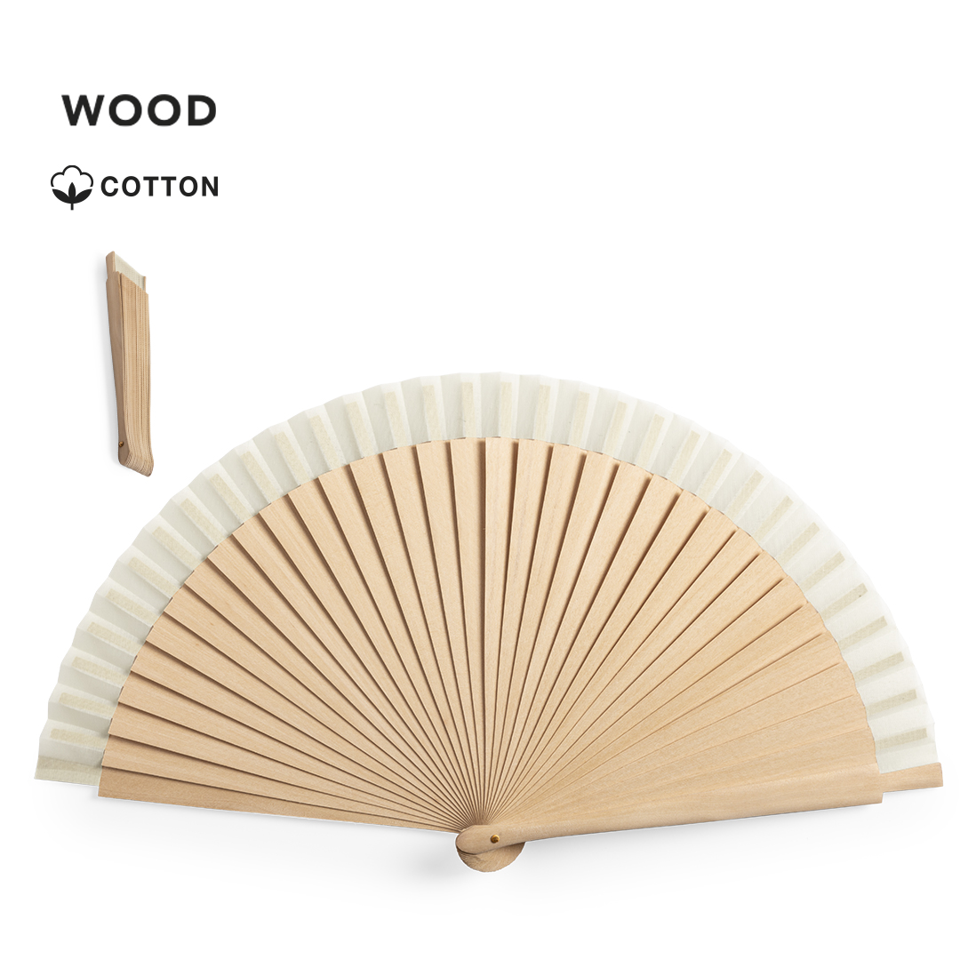 Abanico de línea nature, con varillas de madera y tela en algodón. Presentado en caja individual de diseño eco.