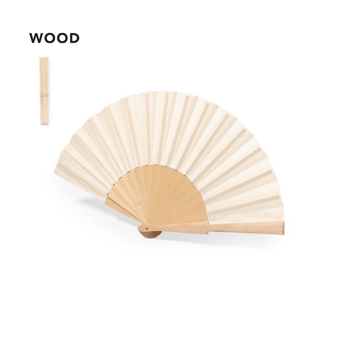 Abanico fabricado con varillas de madera y tela en algodón en combinación con el poliéster. De color natural y presentado en caja individual diseño kraft.