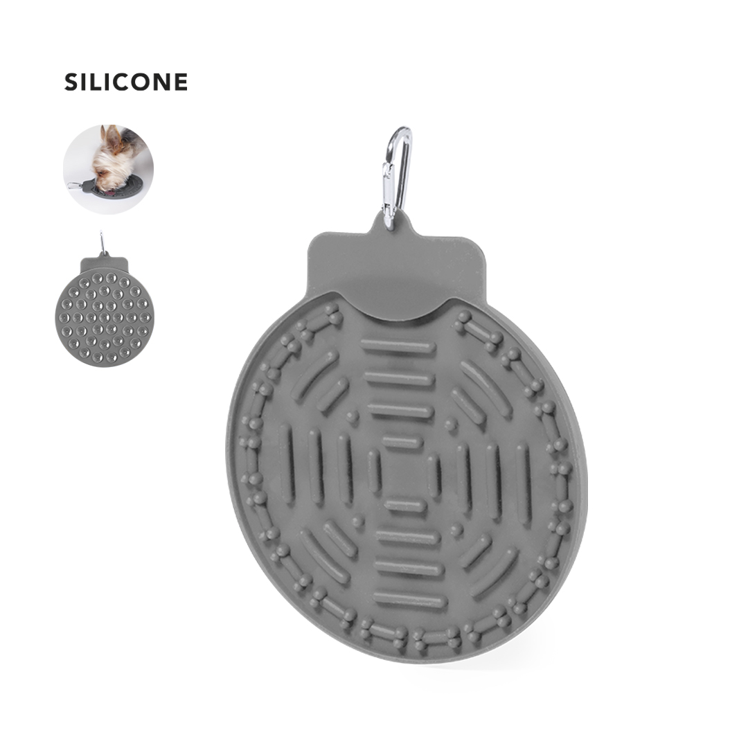 Almohadilla de mascotas para lamer fabricada en suave silicona. Con potentes ventosas para fijarla en superficies planas y que las mascotas puedan lamer su rugosa superficie. Mosquetón de transporte incorporado de fácil enganche. Presentado en una bolsa individual reciclada.