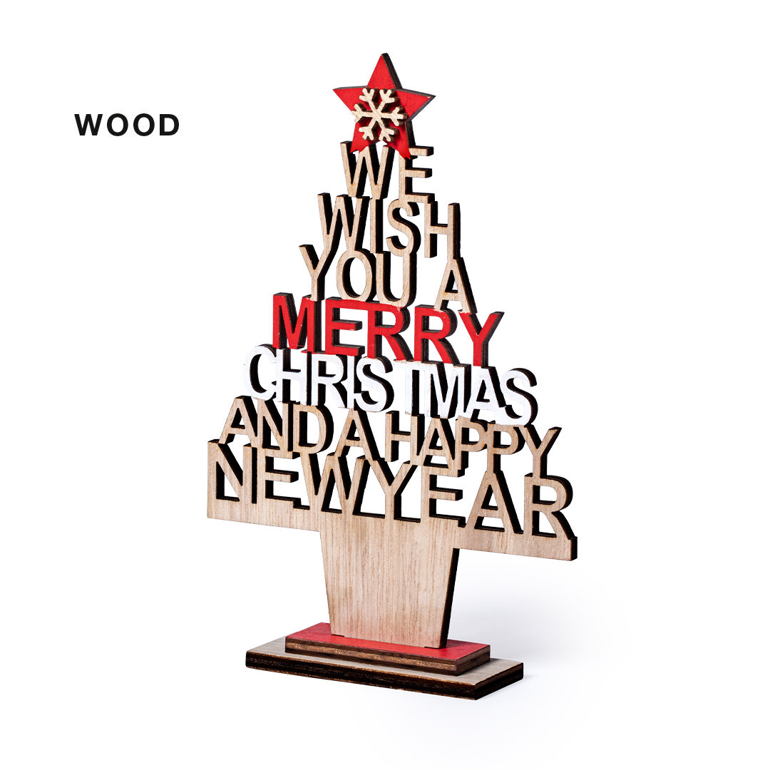 Original árbol de navidad con mensaje troquelado. Fabricado en madera, con amplia superficie de marcaje. Base desmontable y presentado en bolsa individual