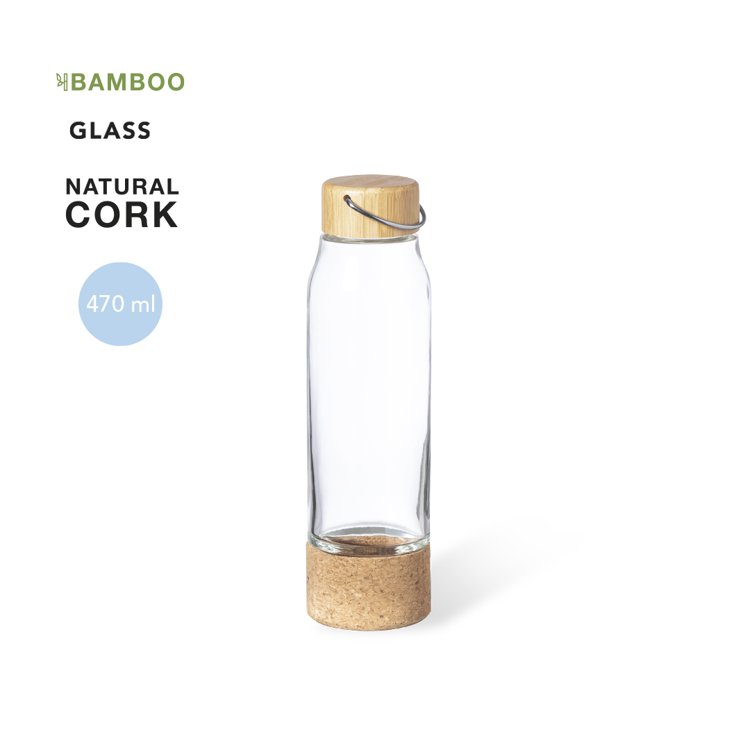 Bidón de línea nature y 470 ml de capacidad. Cuerpo fabricado en cristal, con base en corcho. Incluye original tapón a rosca de bambú con asa integrada. Presentado en caja individual de diseño eco.