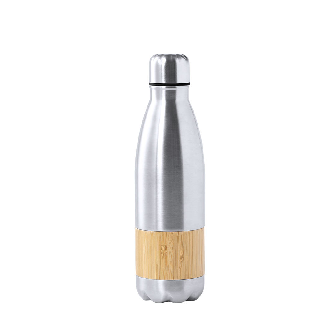 Bidón de línea nature, en combinación de materiales acero inox de acabado mate y bambú. 750ml de capacidad, con tapón de seguridad y presentado en atractiva caja de diseño eco.