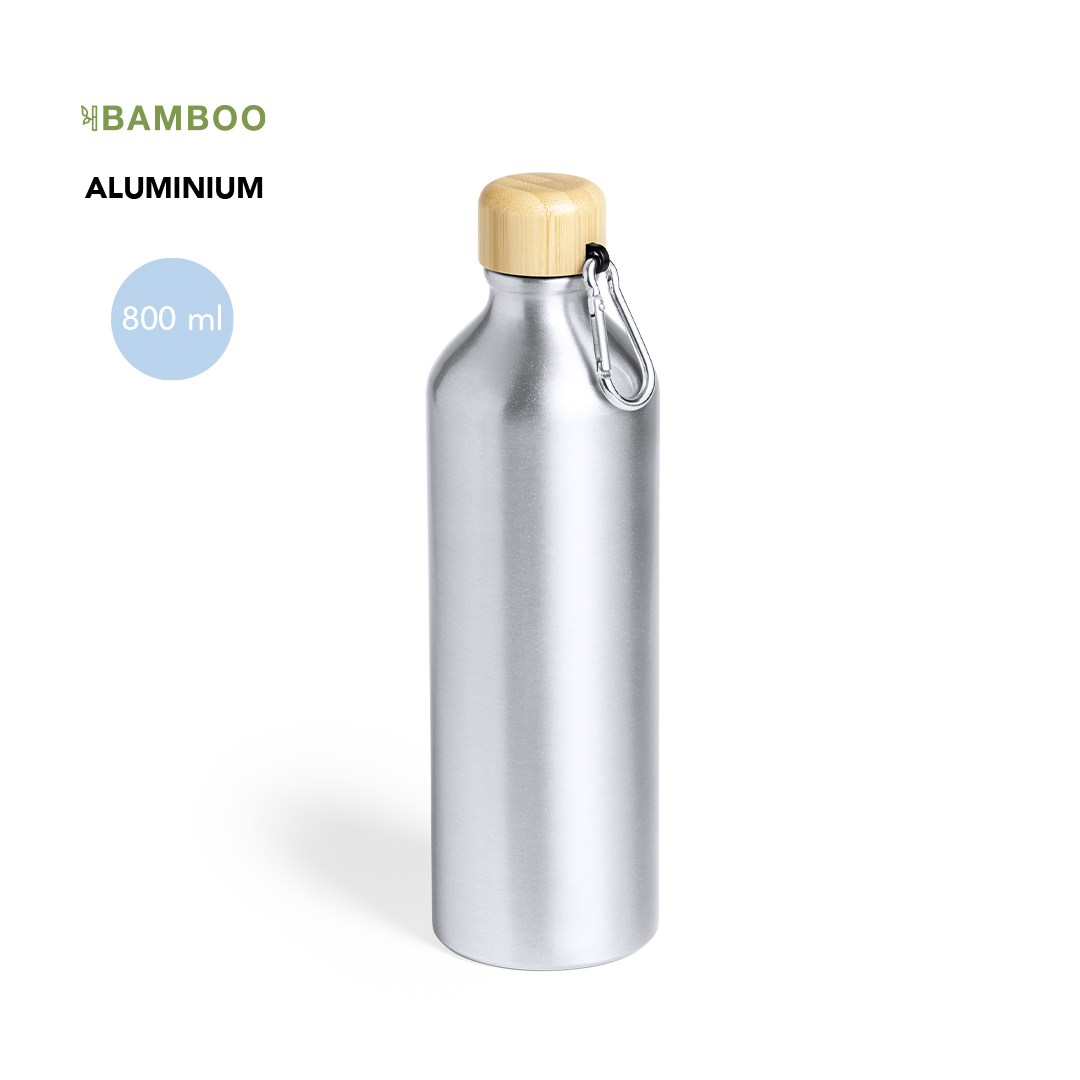 Bidón de línea nature y 800 ml de capacidad. Cuerpo en aluminio de acabado mate y tapón de bambú con mosquetón a juego para fácil transporte. Libre de BPA y presentado en atractiva caja de diseño eco.