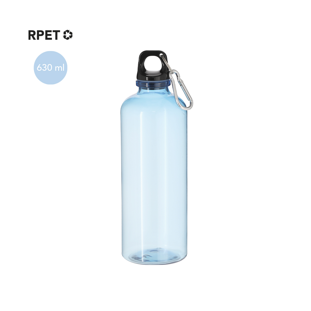 Bidón fabricado en resistente material RPET, con una capacidad de 630 ml. Cuerpo translúcido y tapón negro de cierre a rosca para garantizar un sellado óptimo. Incluye mosquetón metálico que facilita su transporte. Libre de BPA.El material RPET se elabora a partir de plástico reciclado, para así fomentar la reutilización de residuos plásticos y ayudar a la sostenibilidad del planeta.