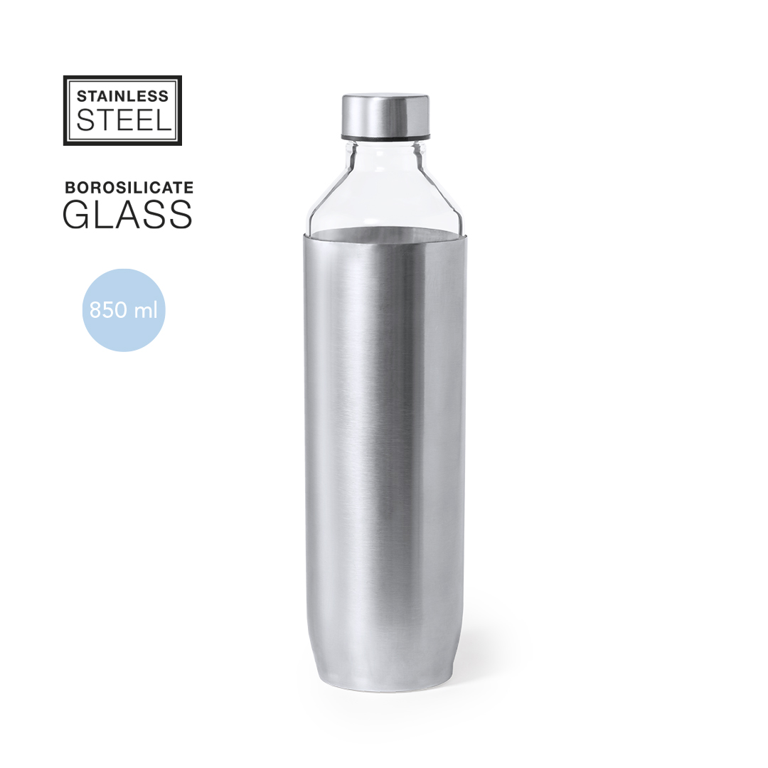 Bidón de diseño en alta calidad, de 850 ml de capacidad. Fabricado en cristal de borosilicato, que ofrece una resistencia, estética y durabilidad excepcionales, alargando su vida útil y pudiendo ser reutilizado infinidad de veces. Tapón y funda del cuerpo del bidón en acero inox. Presentado en atractiva caja de diseño.
