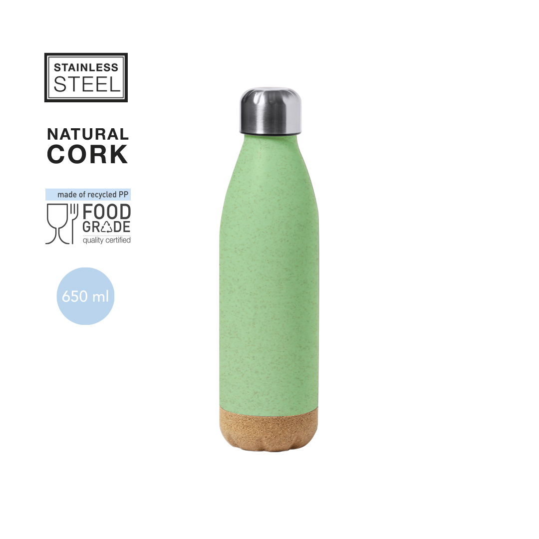 Bidón de 650 ml de capacidad, en combinación de PE veteado con base de corcho natural y tapón en acero inox.Tapón a rosca y libre de BPA. Disponible en variada gama de colores pastel mate y presentado en caja individual de diseño kraft.Certificación Food Grade, garantizando la seguridad cuando los alimentos entran en contacto con el material usado para fabricar el producto.