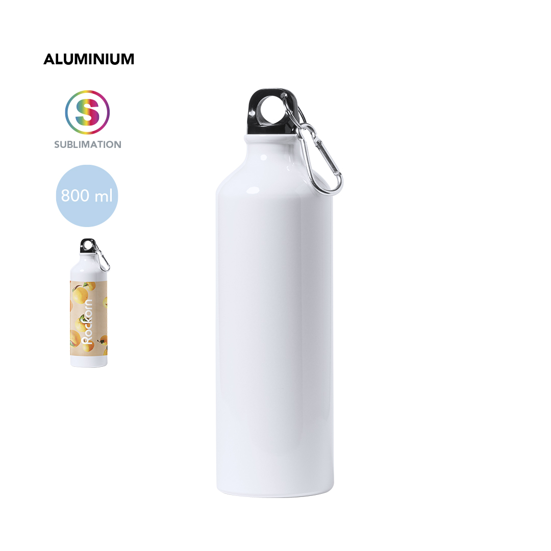 Bidón de aluminio de 800ml de capacidad. Acabado en suave y brillante color blanco, especialmente diseñado para marcaje en sublimación. Con tapón de seguridad a rosca y mosquetón metálico de transporte. Presentado en atractiva caja de diseño.