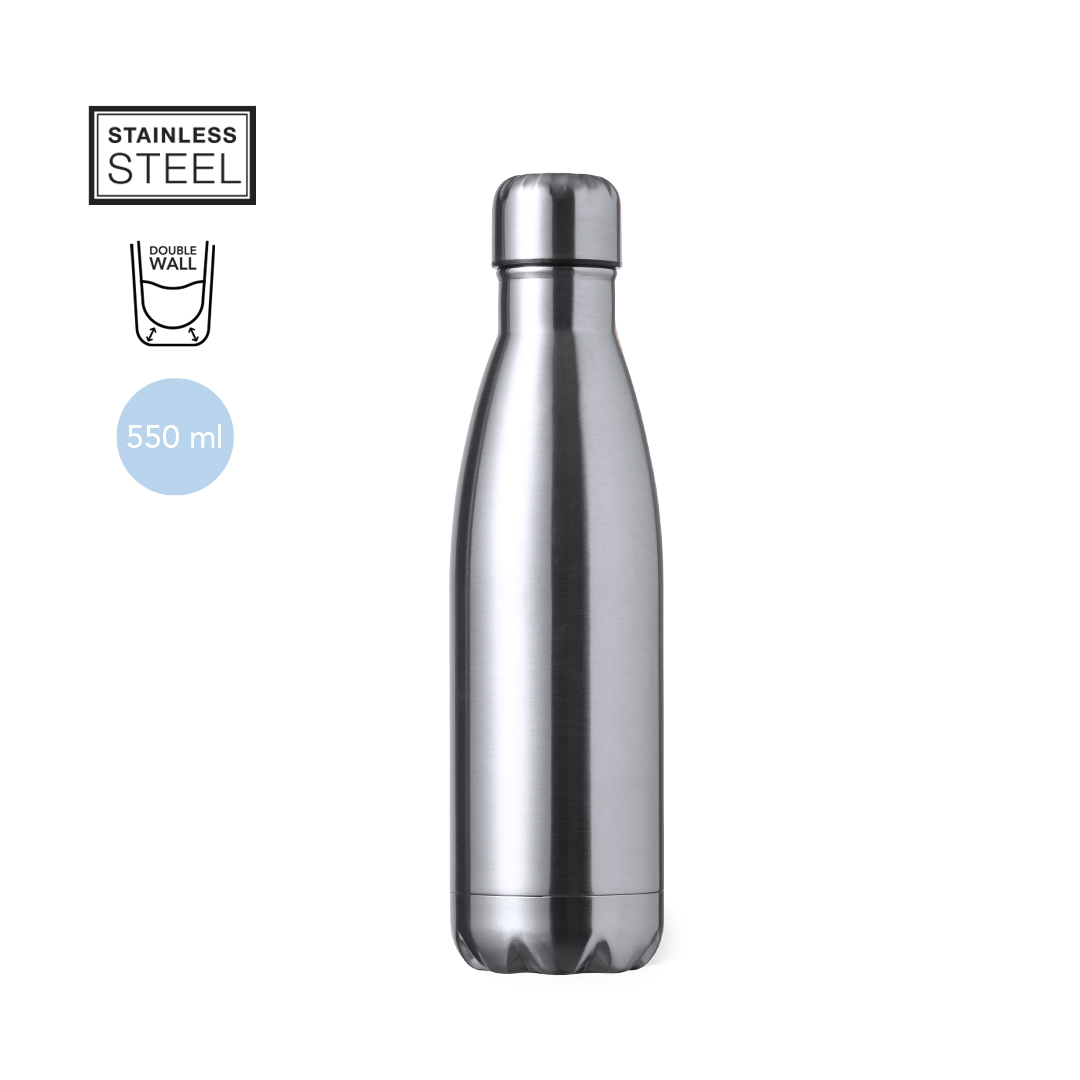 Bidón térmico de 550 ml de capacidad, fabricado en acero inox de doble pared. Con tapón a rosca, libre de BPA y disponible en variada gama de colores satinados. Presentado en caja individual de diseño kraft.Disponible manual de instrucciones en español e inglés.