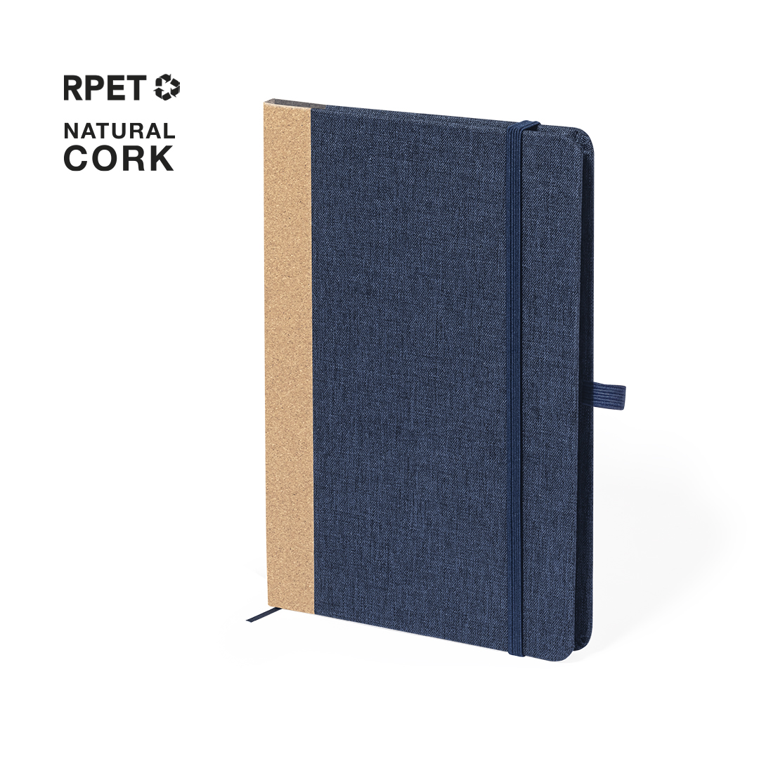 Bloc de notas con tapas rígidas fabricadas en RPET, con el lomo en corcho. Incluye interior con 80 hojas lisas, marcapáginas, elástico de cierre y soporte para bolígrafo a juego. logotipo RPET en contraportada y disponible en elegantes colores. Presentado en una bolsa individual de papel reciclado.El material RPET se elabora a partir de plástico reciclado, para así fomentar la reutilización de residuos plásticos y ayudar a la sostenibilidad del planeta.