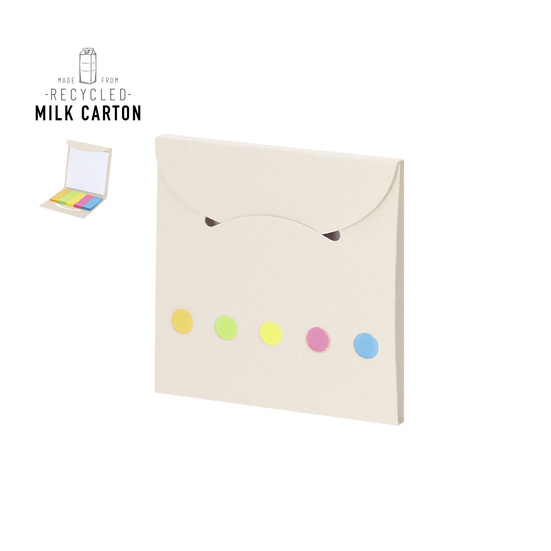 Bloc de notas con cubiertas fabricadas en cartones de leche reciclados. Con tapas blandas e interior con 50 notas adhesivas cuadradas y 125 mininotas adhesivas en varios colores. Incluye distintivo Recycled Milk Carton.Los cartones de leche se componen en su mayor parte de cartón y aluminio. Durante su proceso de reciclado, se separan los distintos materiales del envase para su reutilización y nuevo uso, contribuyendo así a recorrer el camino infinito de la economía circular. Este material se caracteriza por su alto grado de reciclabilidad, así como por su ligereza y resistencia.50 Notas Adhesivas 7,5 x 7,5 cm. 125 Mininotas adhesivas 1,5 x 5 cm.