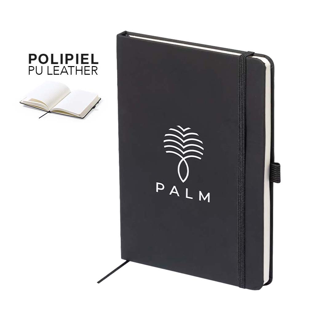 Bloc de notas fabricado en polipiel de elegante acabado en negro. Con tapas duras, marcapáginas y elástico de sujeción a juego. Interior con 100 hojas de disposición a 1 raya y soporte para bolígrafo (bolígrafo no incluido).