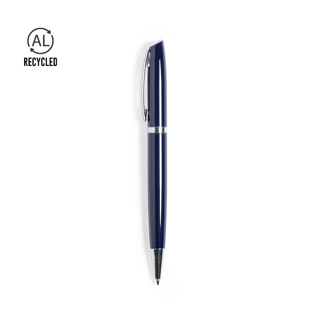 Bolígrafo eco-friendly fabricado en aluminio reciclado. De mecanismo giratorio, con cuerpo disponible en variada gama de colores metalizados y accesorios en cromado. Con clip metálico y distintivo aluminio reciclado en la parte superior del bolígrafo. Cartucho jumbo y tinta azul.El origen del aluminio reciclado se encuentra en la reutilización casi infinita de uno de los materiales con mayor potencial de reciclabilidad sin perder sus propiedades. Esta característica lo convierte en un material eco-friendly de origen reciclado, fácilmente reciclable y de cuyos procesos de tratamiento y desechos para la obtención del material se pueden obtener nuevos recursos reutilizables, consumiendo menos energía en su fabricación, entre otros factores de sostenibilidad. Certificación GRS (Global Recycled Standard / Estándar de Reciclaje Global), que garantiza el origen reciclado del material usado para fabricar el producto.