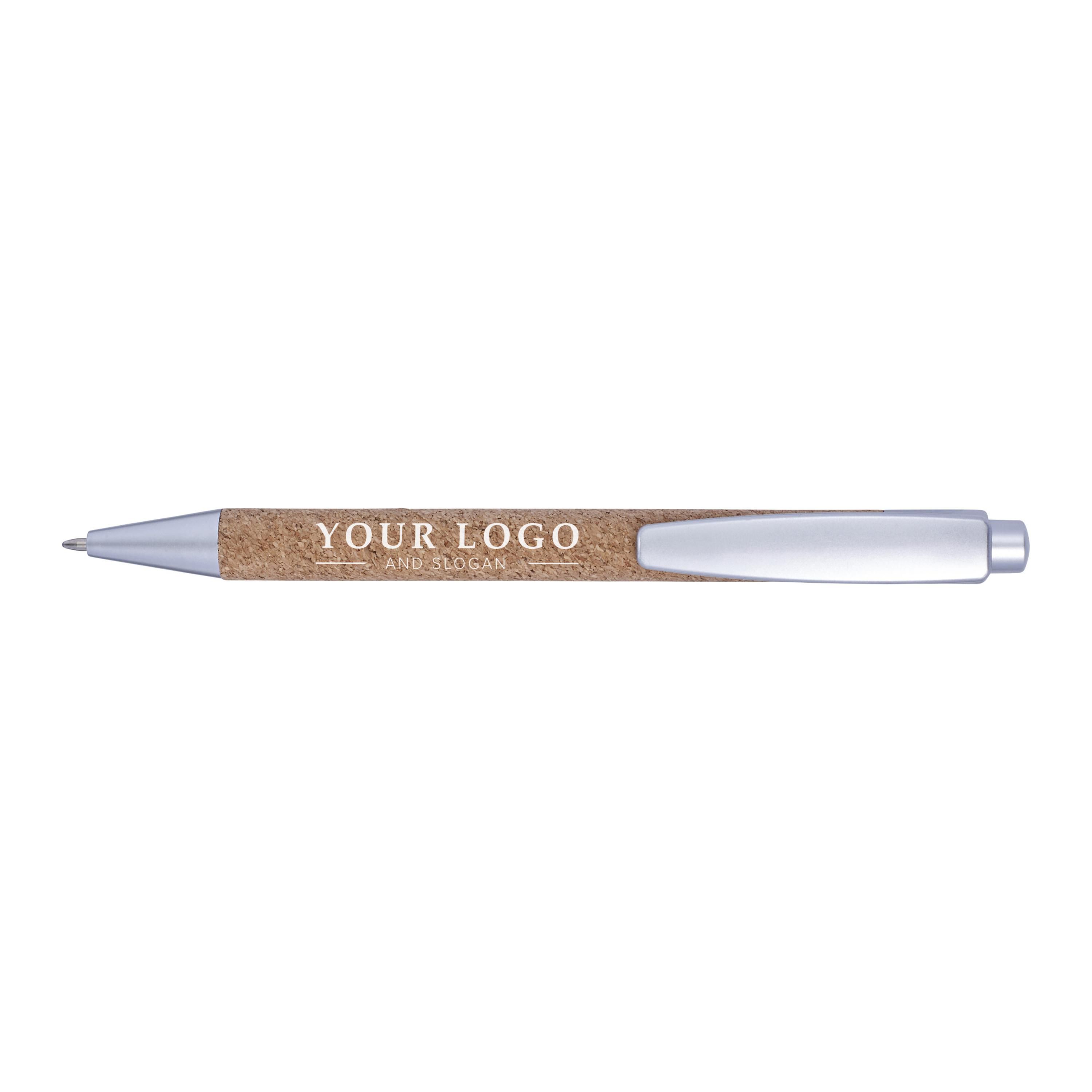Bolígrafo de corcho con pulsador. Punta, clip y botón de plástico. Tinta azul.