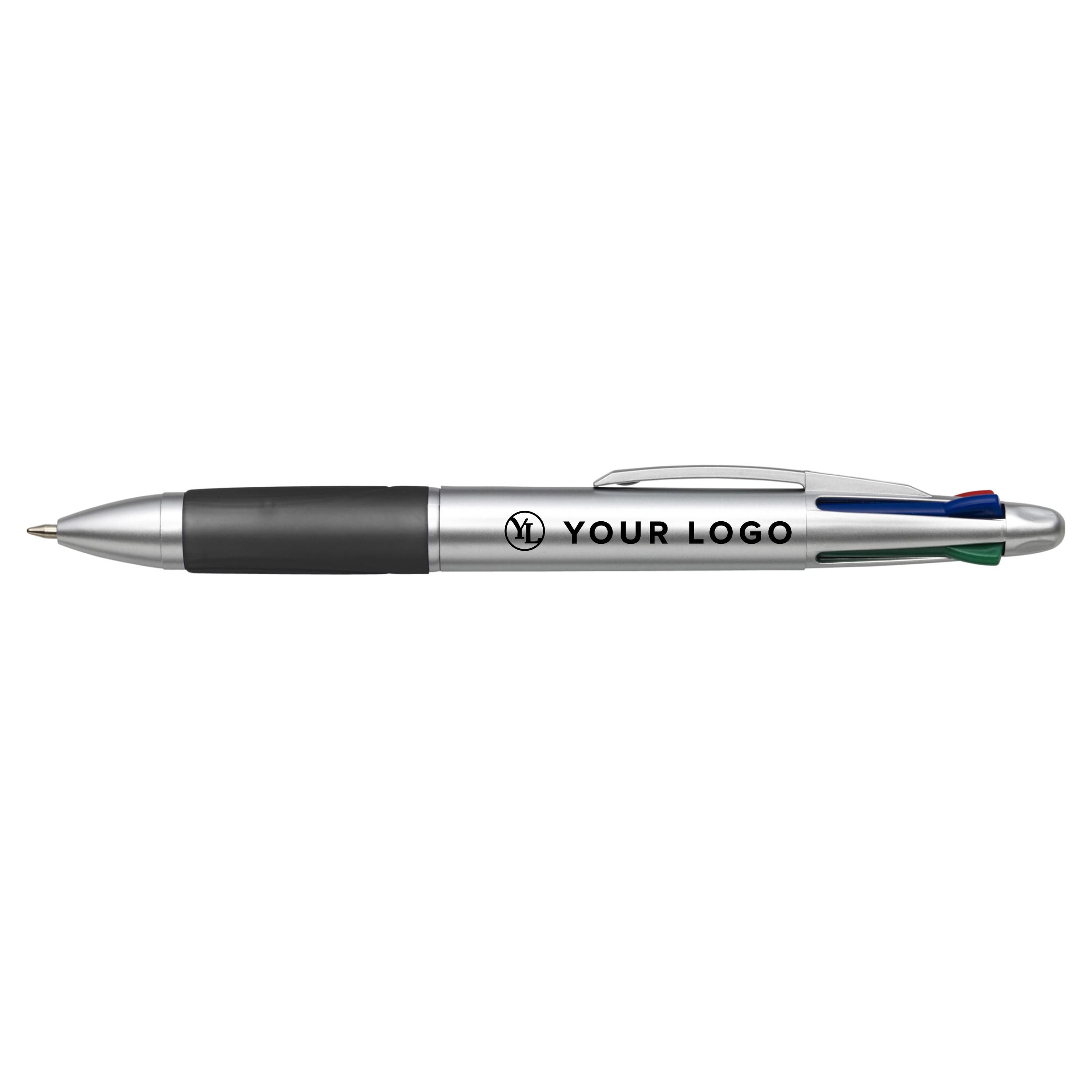 Bolígrafo de plástico con antideslizante de caucho. Tinta de 4 colores: azul, negra, roja y verde.