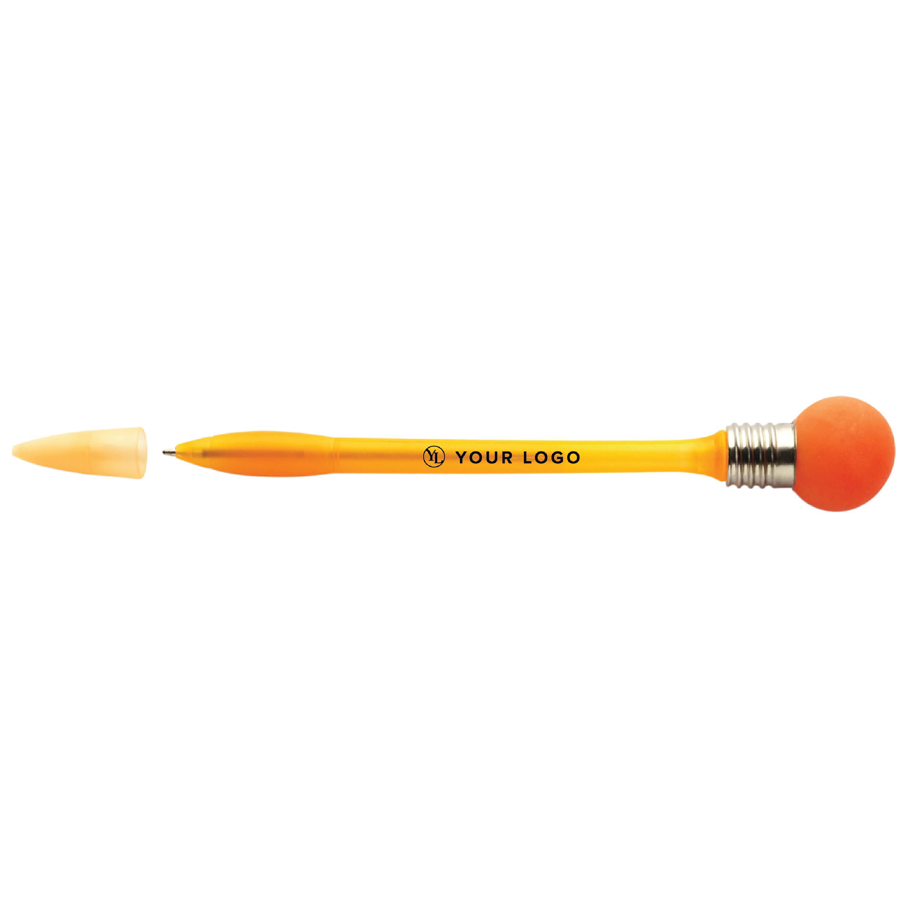 Bolígrafo de plástico con bola de goma con luz intermitente en la parte superior. La luz se activa al darle un golpe. Tinta azul.