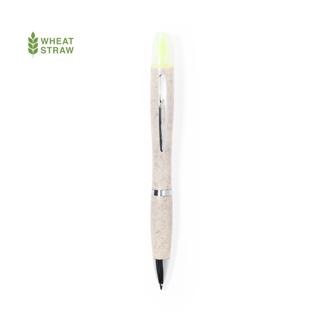 Práctico bolígrafo fabricado en caña de trigo y ABS con marcador incluido. De mecanismo giratorio y en tinta azul. En la parte superior incluye un útil marcador amarillo fluorescente con capucha. Logotipo Wheat Straw en la parte superior del bolígrafo, con clip y accesorios metálicos, y cuerpo color natural. La caña de trigo fomenta la utilización de materias primas naturales, reduciendo así las emisiones contaminantes.