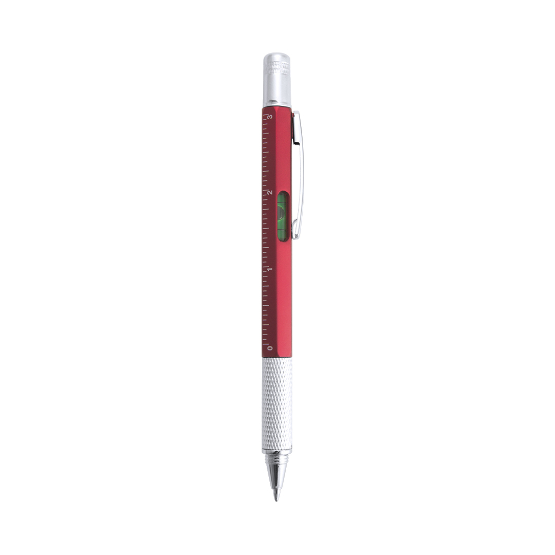 Bolígrafo multiherramienta 4 en 1 de mecanismo giratorio, en variados colores y con suave empuñadura. Con nivel integrado en cuerpo, regla con sistema métrico en centímetros/pulgadas y destornillador de doble cabeza -plana y de estrella-. Con clip metálico y tinta azul.