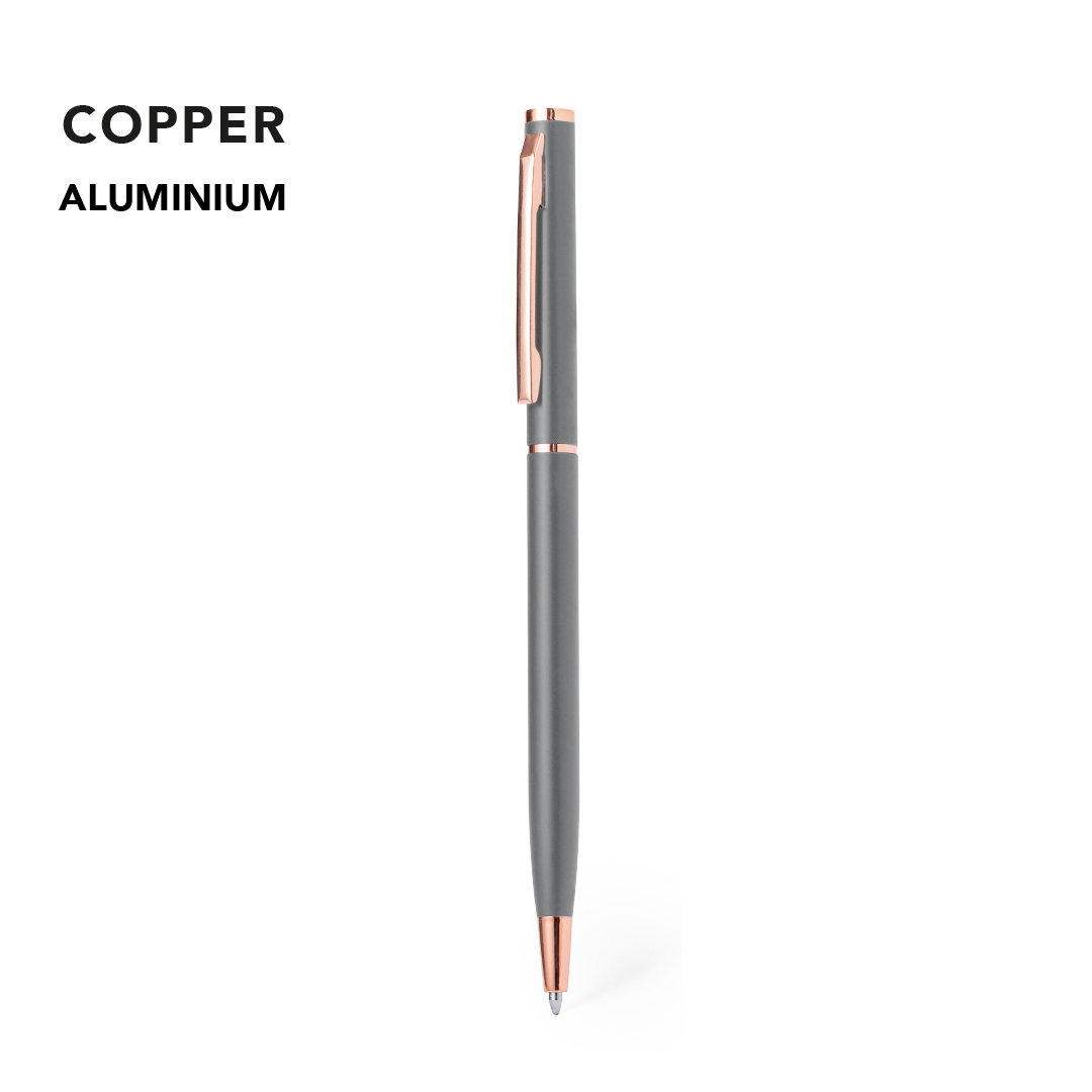 Excelente bolígrafo de aluminio con mecanismo giratorio. Cuerpo en resistente aluminio de acabado mate con elementos decorativos de elegante acabado color cobre, con la caña en una amplia gama de distintivos colores. Clip metálico y de tinta azul. Presentado en una bolsa individual reciclada.
