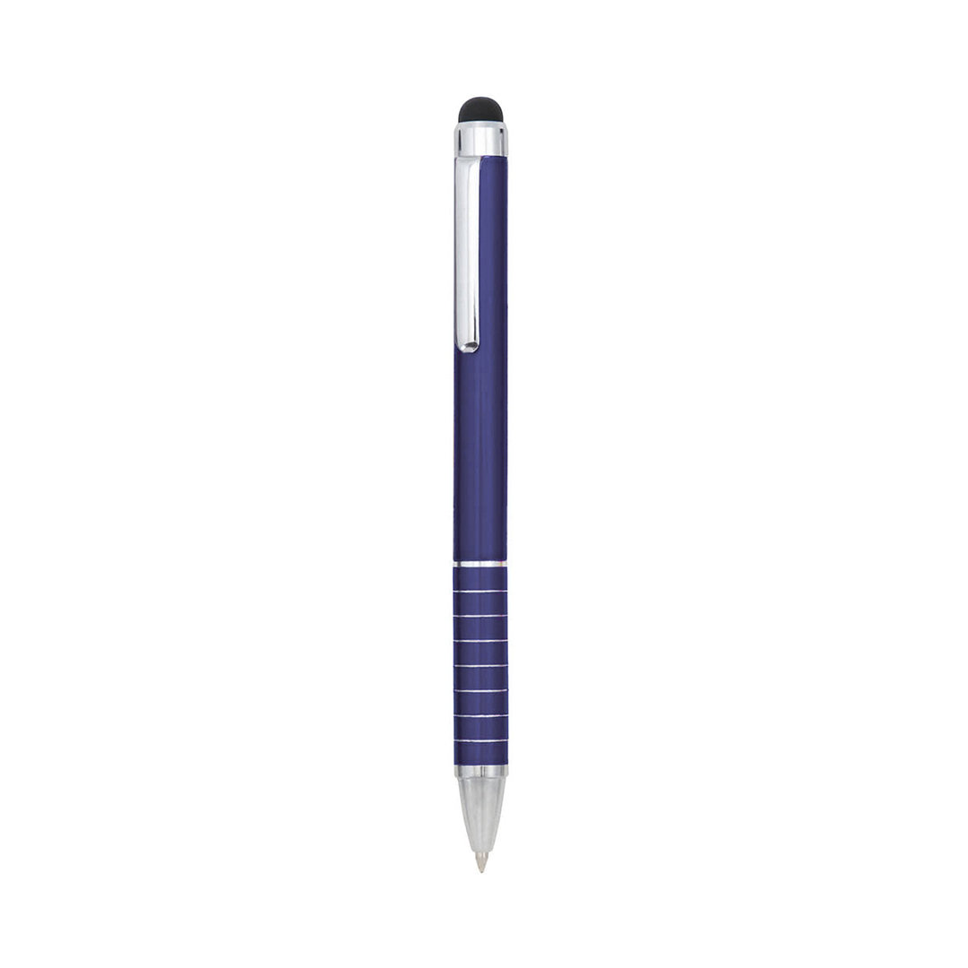 Bolígrafo puntero de mecanismo giratorio con cuerpo en aluminio de suave acabado metalizado en vivos colores. Accesorios y anillas en color plateado. Original empuñadura anillada y tinta azul.
