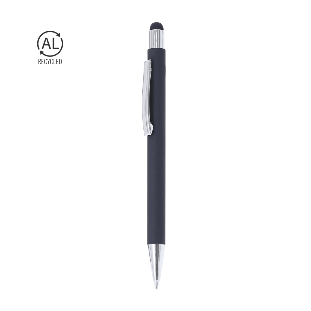 Bolígrafo puntero de mecanismo pulsador fabricado en aluminio reciclado. Pulsador y clip metálico en acabado cromado, acabado en puntero a juego. Cuerpo terminación en goma, especialmente diseñado para marcaje en láser. Distintivo aluminio reciclado en la parte superior del bolígrafo. De cartucho jumbo y en tinta azul. El aluminio reciclado es un material con posibilidades de reciclaje casi infinitas, sin perder sus propiedades originales y consumiendo menos energía en este proceso.Certificación GRS (Global Recycled Standard / Estándar de Reciclaje Global), que garantiza el origen reciclado del material usado para fabricar el producto.