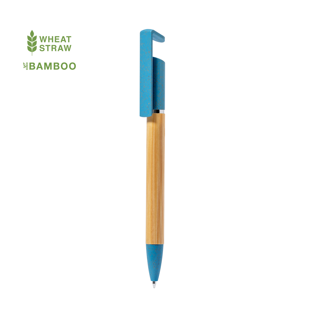 Práctico bolígrafo soporte fabricado en bambú y caña de trigo. Cuerpo en bambú, con accesorios en caña de trigo a color y elementos decorativos metálicos. De mecanismo giratorio, con soporte integrado en clip para dispositivo móvil. En tinta azul, con carga jumbo y disponible en variados colores.Materiales como el bambú fomentan la utilización de materias primas naturales reduciendo las emisiones contaminantes. Además, el bambú proviene de una planta de gran resistencia y versatilidad, con crecimiento y regeneración rápida, siendo una excelente alternativa al uso de madera tradicional.
