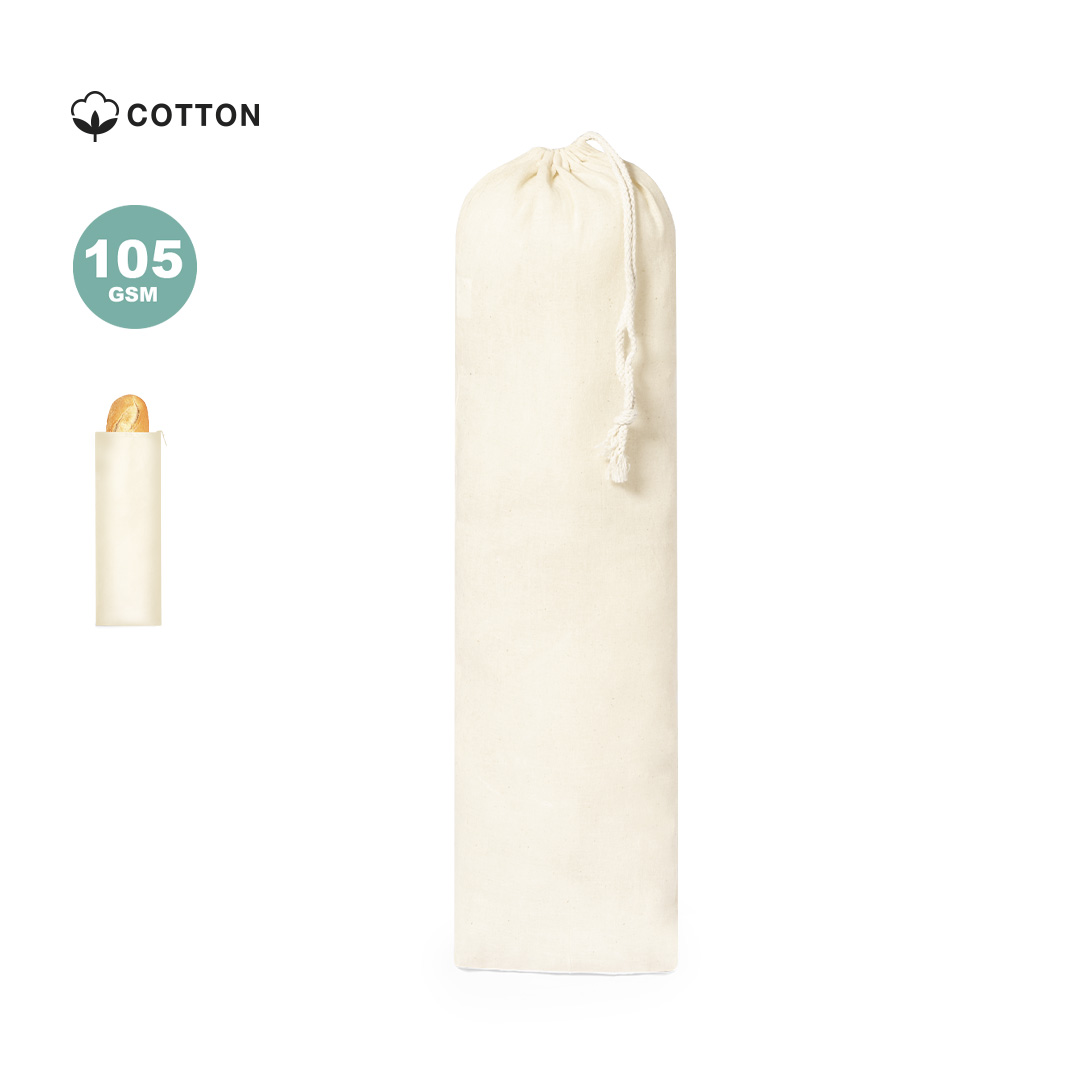 Bolsa tipo pan en material 100% algodón natural con cierre de cordón a juego. Acabado cosido.