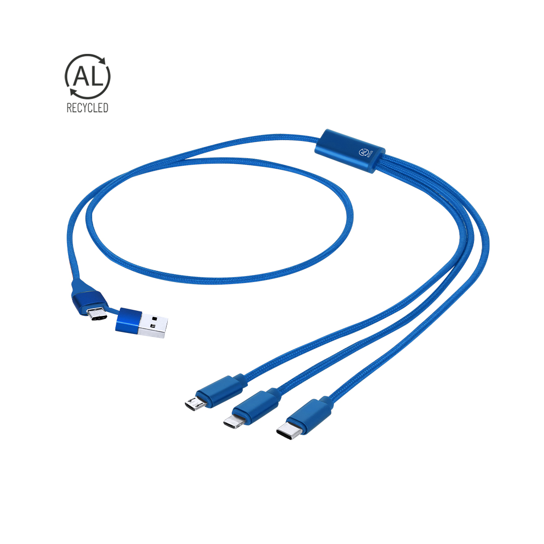 Cable cargador en Aluminio Reciclado. Con conexión de entrada dual Tipo C/USB y salidas Tipo C, Lightning y Micro USB. Incluye distintivo Aluminio Reciclado.El Aluminio Reciclado es un material con posibilidades de reciclaje casi infinitas, sin perder sus propiedades originales y consumiendo menos energía en este proceso.Certificación GRS (Global Recycled Standard / Estándar de Reciclaje Global), que garantiza el origen reciclado del material usado para fabricar el producto.Conexión Micro USB, Tipo C y Lightning 5V DC 2.4A