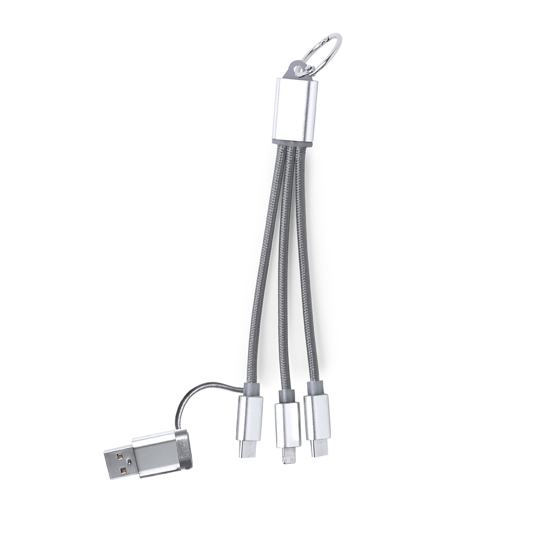 Cable cargador con conexión dual micro USB/Lightning y tipo C (entrada y salida). Conectores de aluminio y chapa especialmente diseñada para marcaje en láser.