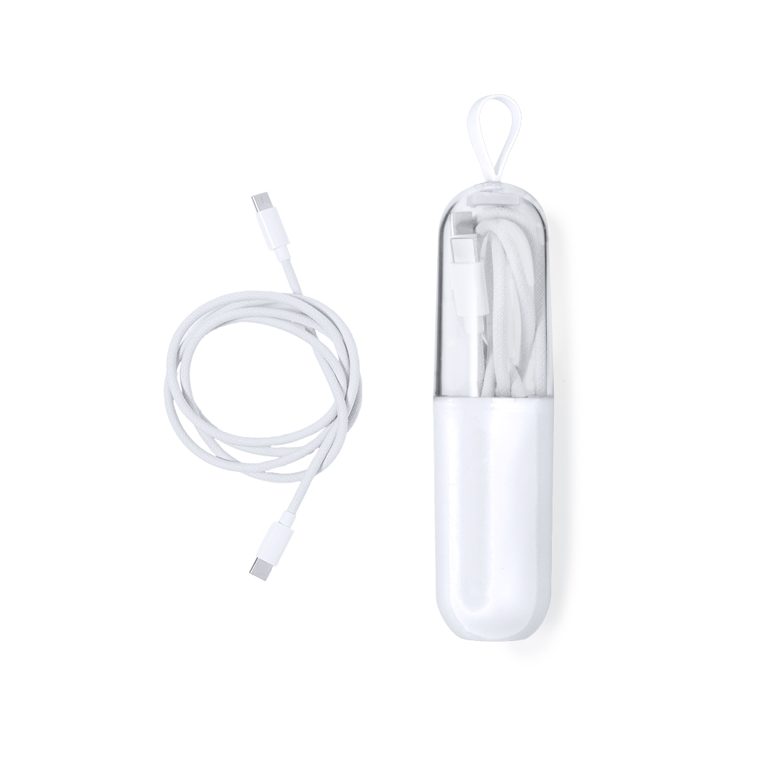 Cable cargador con conexión dual Tipo C. De 65W de potencia y apto para transferir datos. 100cm de longitud, con conectores de aluminio y presentado en atractivo estuche con una parte transparente y otra opaca. Con asa de transporte y presentado individualmente en bolsa reciclada.