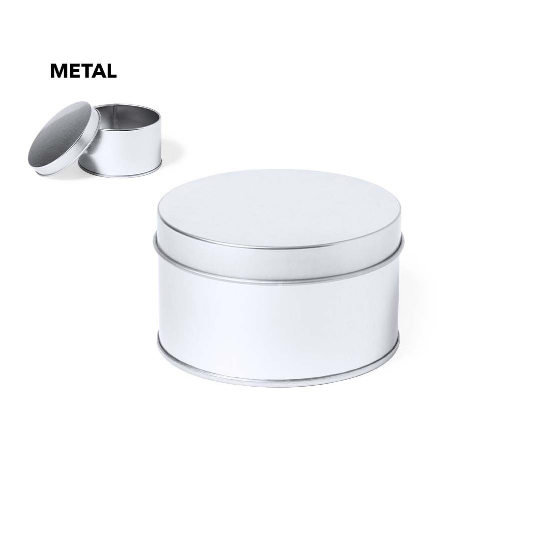 Caja de presentación formato redondo, fabricada en resistente metal de acabado plateado y con tapa a juego.