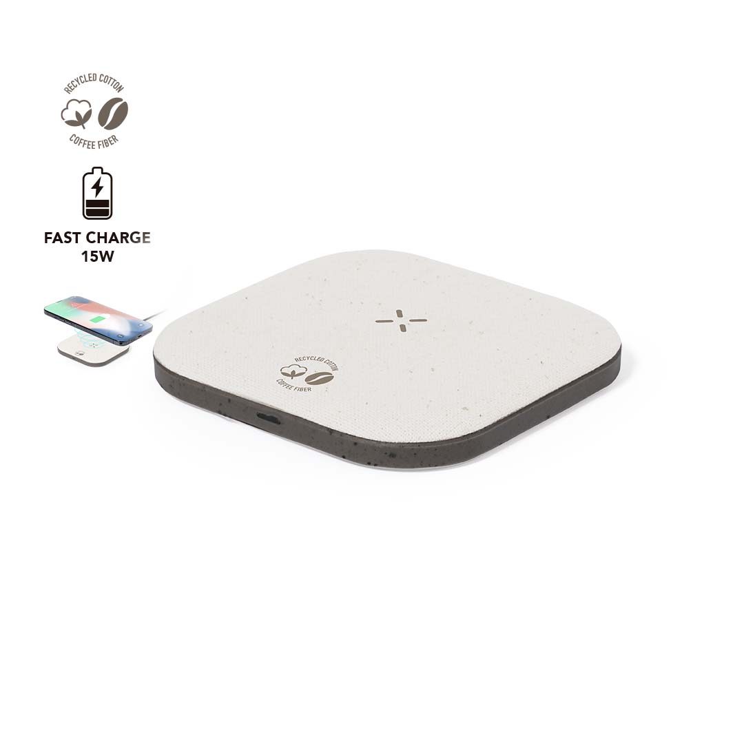 Cargador inalámbrico fabricado en fibra de café y algodón reciclado. Base antideslizante y compatible con dispositivos equipados con tecnología de carga Qi. Capacidad de carga de 15W, con cable negro Tipo C incluido. Con distintivos de fibra de café y algodón reciclado. Presentado en atractiva caja de diseño kraft, con manual de instrucciones en español e inglés.La fibra de café es una solución circular que se obtiene de la utilización de los residuos producidos en la obtención del café. Una alternativa sostenible que favorece la reducción del uso de plásticos, ahorrando energía en su proceso de fabricación y contribuyendo al cuidado del medio ambiente.Disponible certificación GRS (Global Recycled Standard / Estándar de Reciclaje Global), que garantiza el origen reciclado del material usado para fabricar el producto.