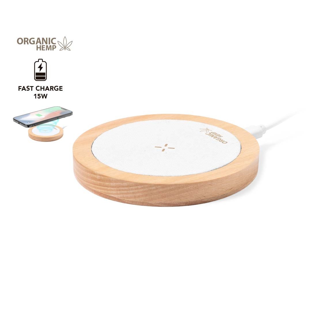 Cargador inalámbrico de 15W, con carcasa fabricada en combinación de cáñamo orgánico y madera natural. Compatible con dispositivos equipados con tecnología de carga inalámbrica Qi. Incluye cable cargador Tipo C y manual de instrucciones en español e inglés. Presentado en caja individual de diseño kraft.El cáñamo se obtiene de la planta cannabis, cuyos procesos tanto de cultivo como de obtención de fibras, son respetuosos con el medio ambiente, dando como resultado un material de gran resistencia, de origen natural y sostenible. Fabricado conforme a los estándares RoHS y en cumplimiento con los siguientes requisitos de seguridad:Sistema de protección contra sobrecalentamiento.Sistema de protección contra sobrecarga.Sistema de bloqueo para evitar cortocircuitos.