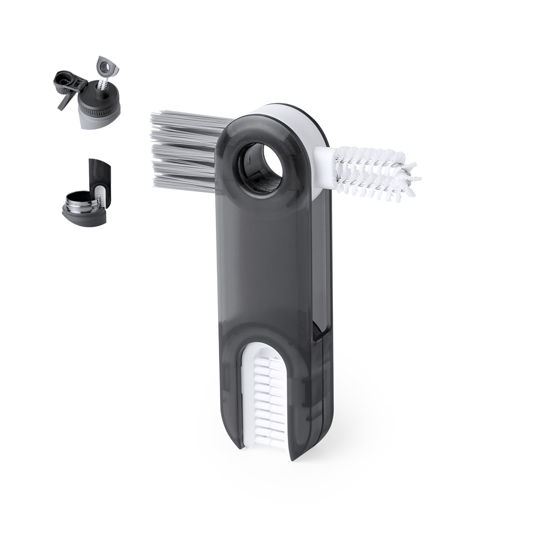 Práctico cepillo limpiador todo en uno, especialmente diseñado para bidones, termos, tazas, vasos y artículos similares. Incluye 3 cepillos con diferentes tipos de cerdas, ideales para la correcta limpieza de las partes de difícil acceso de los recipientes. Fabricado en resistente material ABS, con zona lisa para marcaje y presentado en caja individual de diseño kraft.