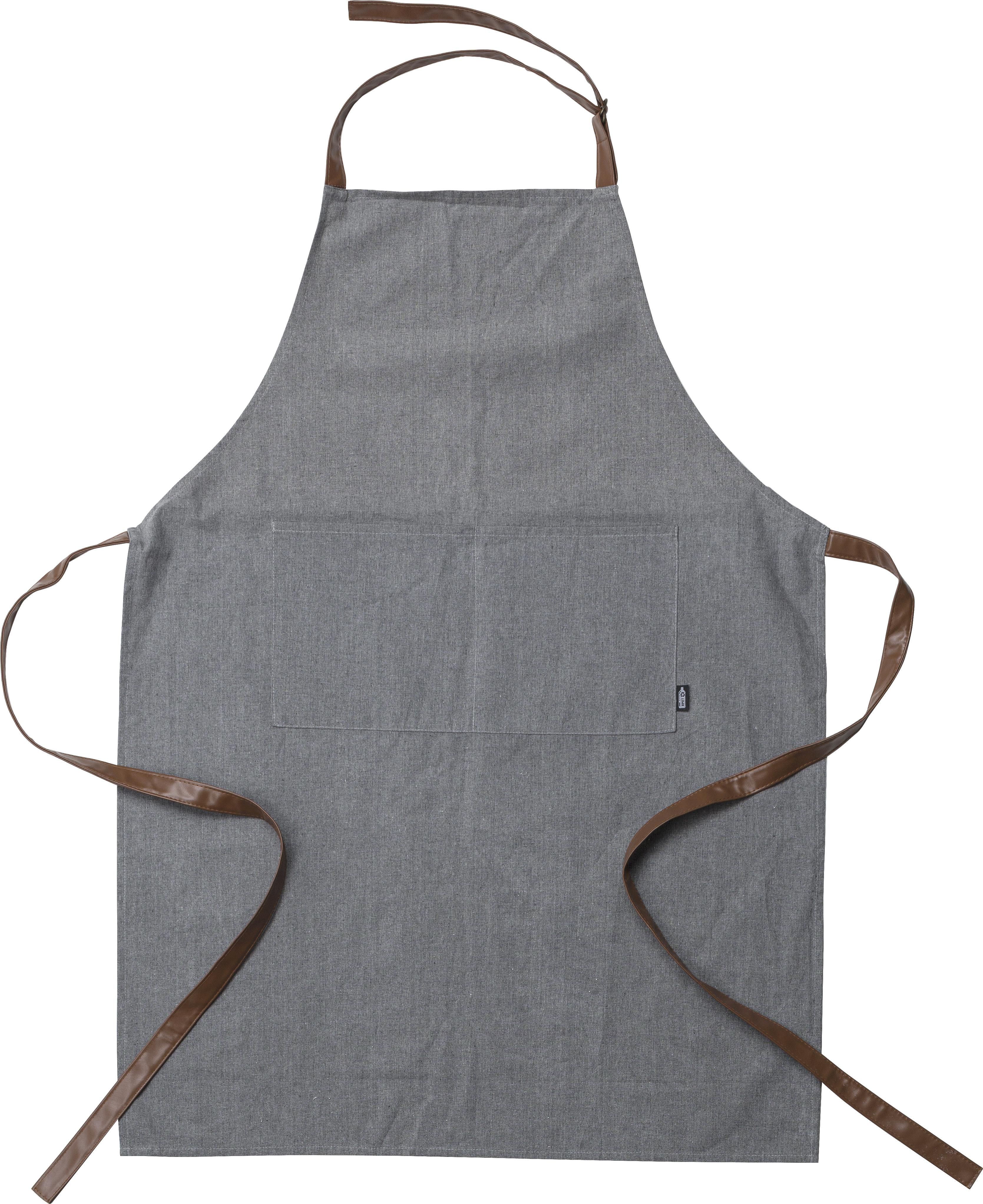 Delantal 50% rPET y 50% algodón con tirantes ajustables de PU. Incluye bolsillo delantero.