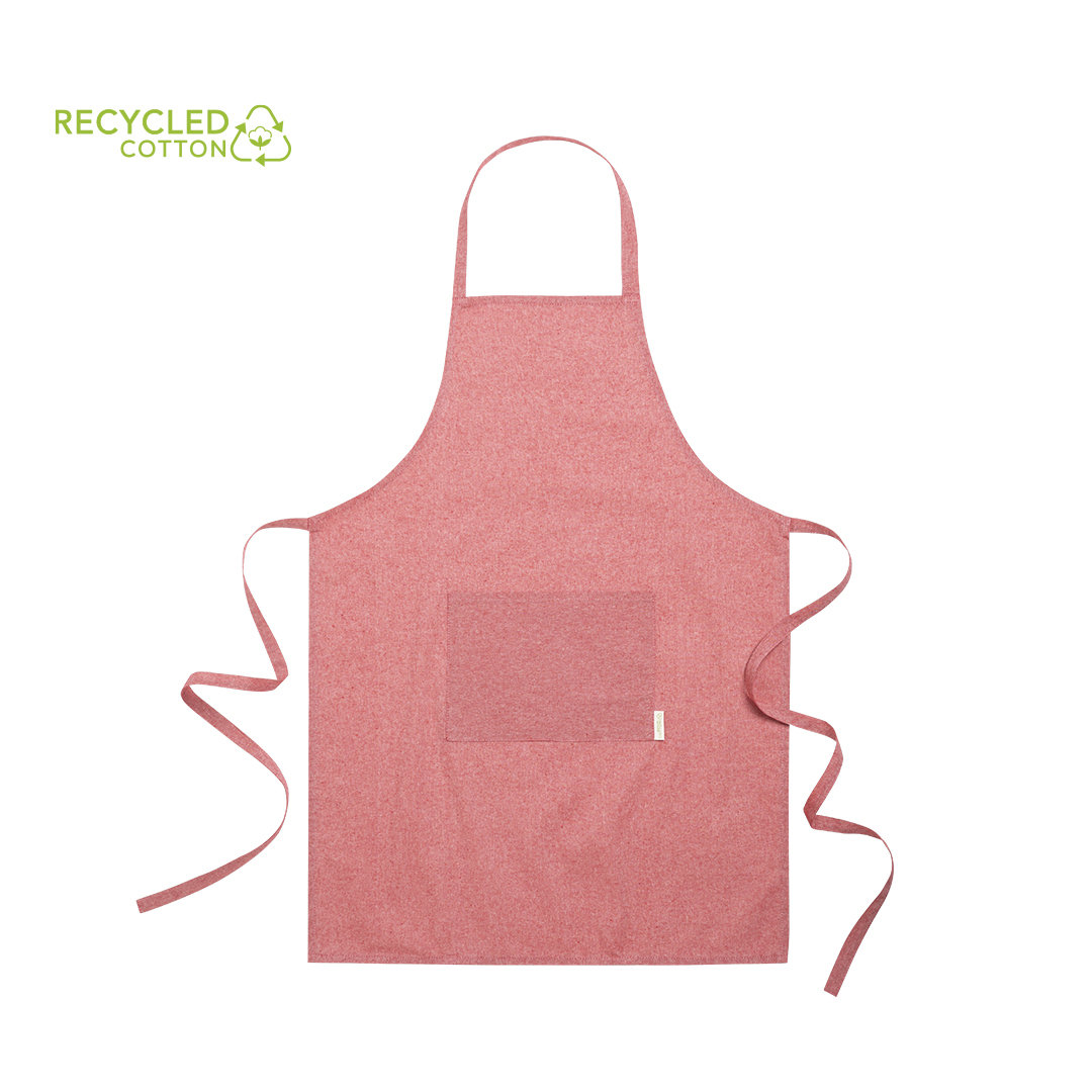 Delantal de línea nature, elaborado en algodón reciclado. Con bolsillo frontal y cintas de ajuste, de corte por debajo de la rodilla. Disponible en variada gama de colores, con distintivo algodón reciclado en etiqueta.