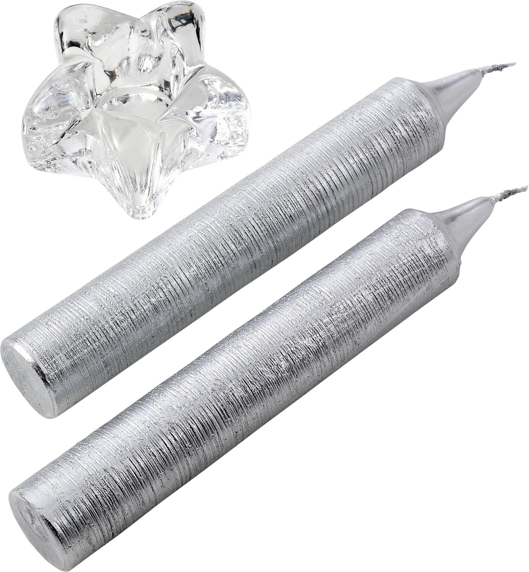 Set de dos velas brillantes y un portavelas de cristal, con forma de estrella. Presentado en una caja de regalo.