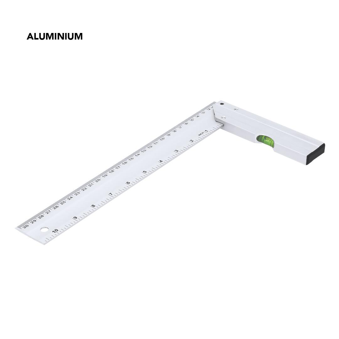 Escuadra en forma de L, fabricada en aluminio, con una longitud de 30,5 cm y medidas en pulgadas de 10,5”. Diseñada con una empuñadura que incorpora un nivel y un práctico agujero para colgar, facilitando su almacenamiento.