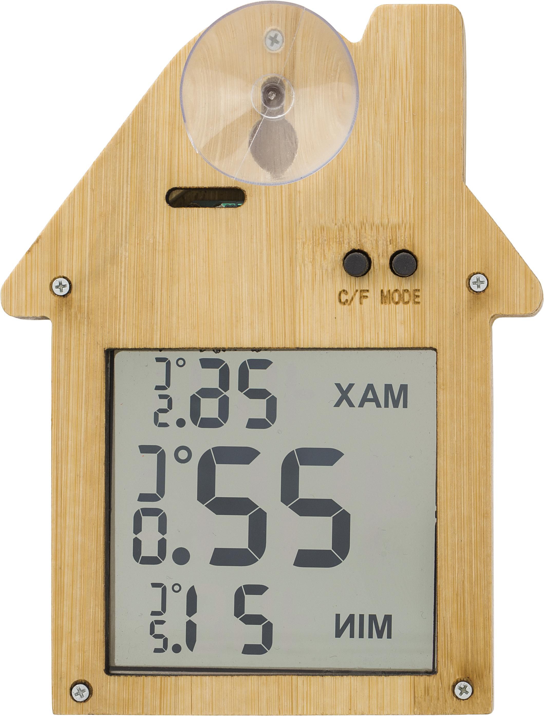 Estación meteorológica de bambú con forma de casa. Con ventosa en la parte trasera. Funciones: temperatura actual, temperatura mínima y temperatura máxima. Pilas incluidas. Presentada en una caja de cartón marrón.