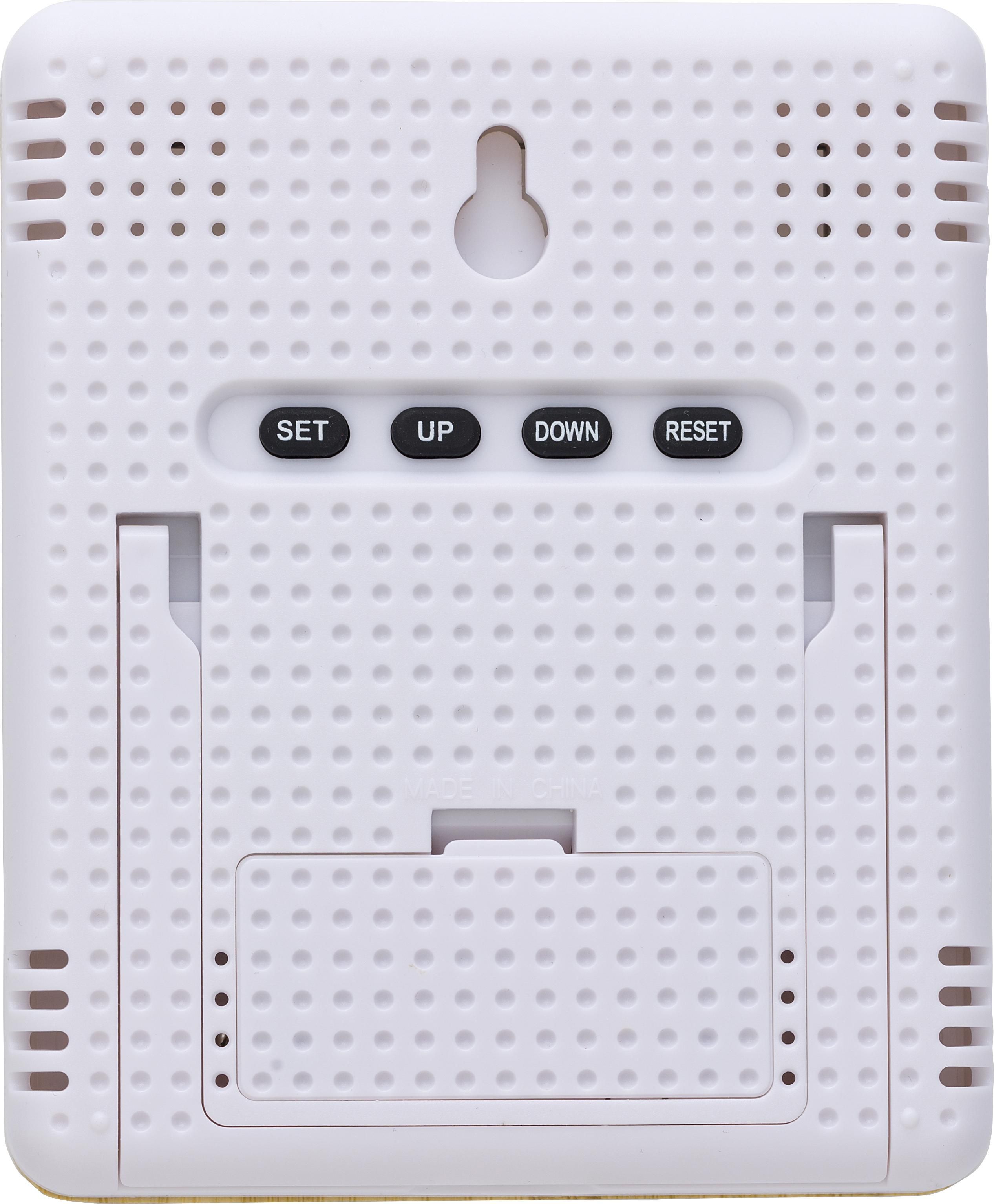 Estación meteorológica de bambú y ABS, con soporte plegable. Funciones: reloj, año, temperatura y humedad. Pilas incluidas.