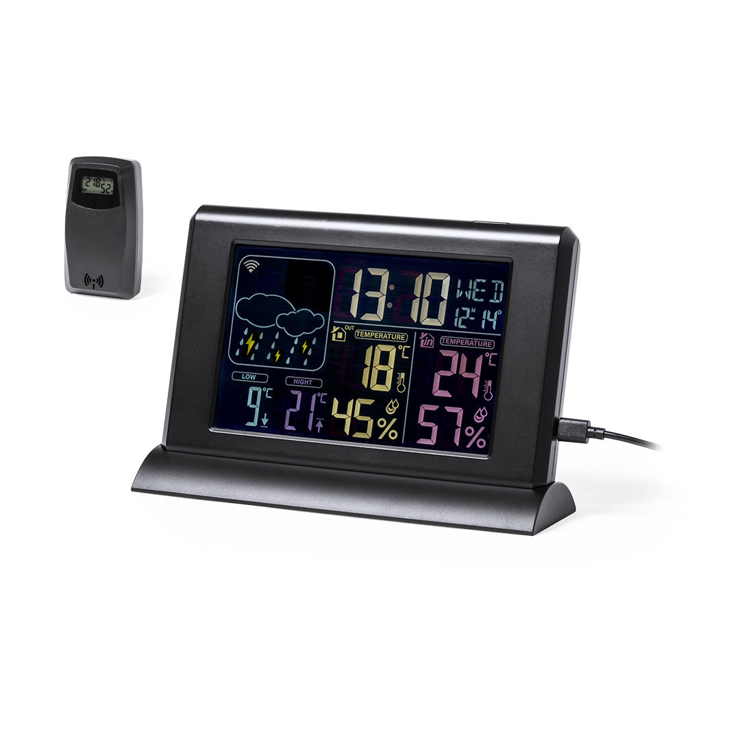 Estación meteorológica premium multifunción, fabricada en resistente ABS de acabado negro satinado. Incluye pantalla retroiluminada, de fácil lectura y con gráficos en color. Con sensor inalámbrico para temperatura/humedad exterior y sensor integrado para temperatura/humedad interior. Funciones alarma y calendario, con APP disponible -compatible con iOS/ Android- para control remoto a través de red WiFi y funciones extra. Adaptador de corriente y cable USB incluido de 1 m de largo, con soporte para montaje en la pared. Sensor externo con alimentación a pilas (2xAAA no incluidas). Presentación en caja individual de diseño kraft, con manual de instrucciones en español e inglés.