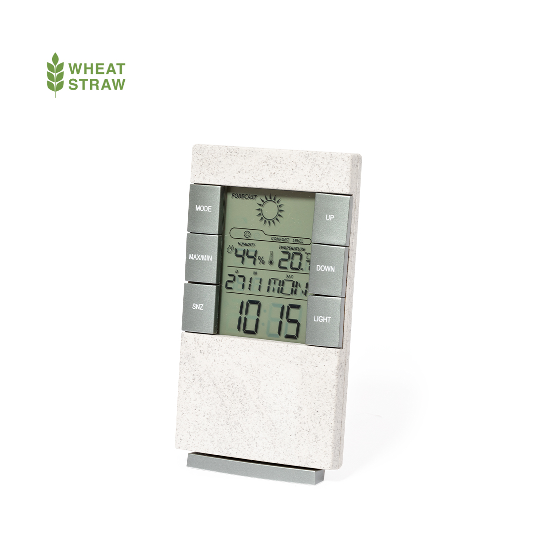 Estación meteorológica fabricada en caña de trigo, con termómetro e higrómetro. Función de hora, calendario, alarma y día de la semana, fácilmente visibles en la pantalla retroiluminada. Con base soporte y enganche para colgarlo. Alimentación a pilas (2xAAA no incluidas) y presentada en atractiva caja de diseño kraft. Disponible manual de instrucciones en español e inglés.La caña de trigo fomenta la utilización de materias primas naturales, reduciendo así las emisiones contaminantes.