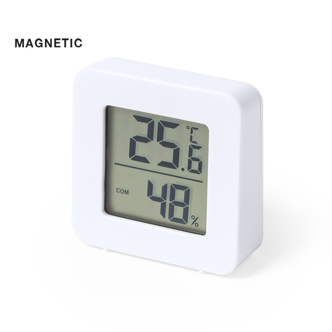 Estación meteorológica fabricada en resistente ABS de acabado blanco. Pantalla LCD de fácil lectura con termómetro y medidor de humedad. Fijación magnética y alimentación con pila (de botón incluida, con film protector). Presentada en caja individual de diseño kraft, con manual de instrucciones en español e inglés.