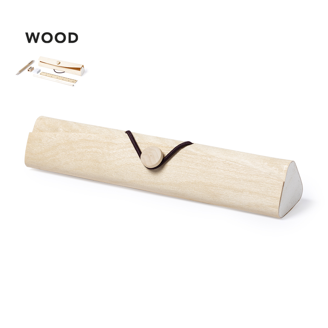 Estuche de línea nature fabricado en madera, con cinta elástica de cierre. 5 accesorios incluidos: 1 x bolígrafo de mecanismo pulsador en cartón reciclado, con accesorios en caña de trigo y tinta azul. Distintivo caña de trigo en la parte superior del bolígrafo. 1 x lápiz de madera de 177 mm de largo x 7mm de diámetro (punta sin afilar) 1 x regla de madera de 15 cm / 6 pulgadas 1 x sacapuntas de madera 1 x goma blanca