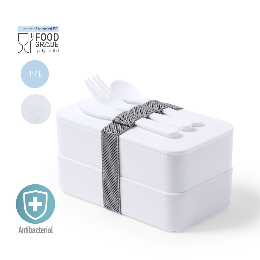 Fiambrera antibacteriana en resistente material PP de acabado sólido, libre de BPA. Dos compartimentos, cada uno de 700 ml de capacidad y cinta de seguridad con tenedor, cuchara y cuchillo. Los productos con tratamientos antibacterianos son capaces de reducir drásticamente las cargas bacterianas presentes en las superficies de los materiales, gracias a la incorporación de agentes microbianos permanentes estáticos, con alta efectividad para inhibir y prevenir la contaminación bacteriana. Artículo de acuerdo al estándar ISO 22196, que determina la actividad antibacteriana en materiales plásticos y superficies no porosas, lo que permite conocer la efectividad de inhibición microbiana que tienen los aditivos sobre los objetos tratados mediante una evaluación cuantitativa.