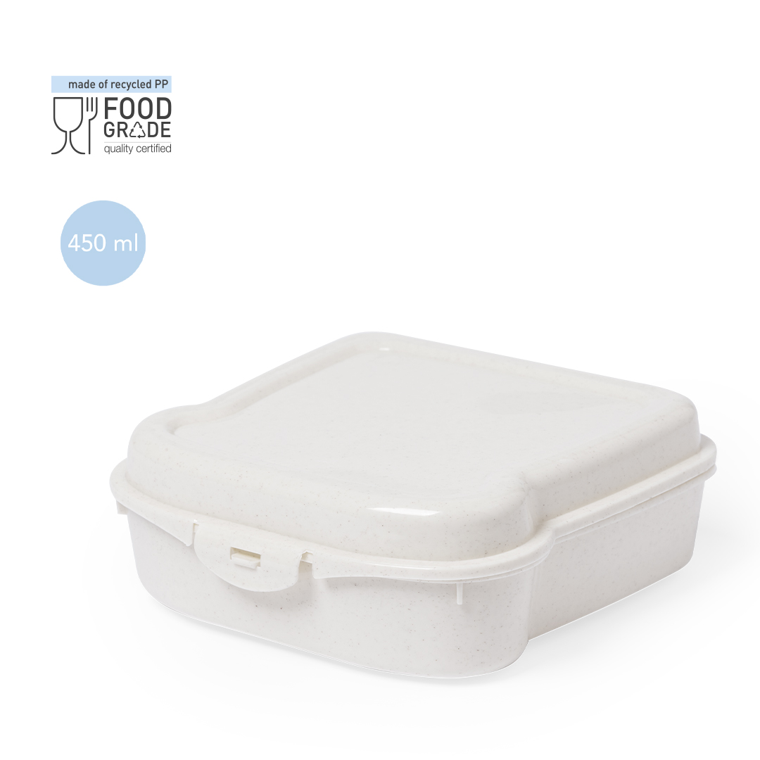Fiambrera para sandwich de 450 ml de capacidad en color natural. Con cierre de seguridad.