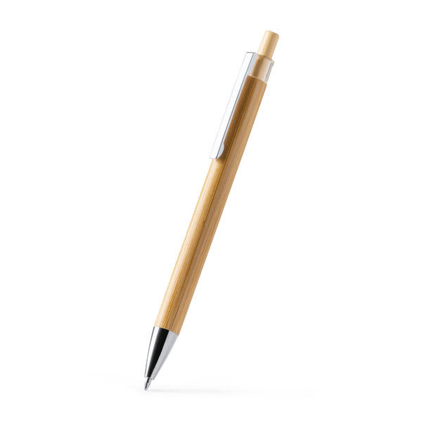 Bolígrafo con cuerpo y pulsador de bambú, clip metálico y detalles cromados. Tinta azul.