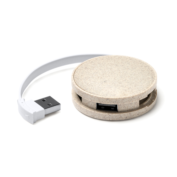 Puerto USB HUB realizado en fibra de trigo. Con 4 puertos USB. Con cable USB de conexión integrado.