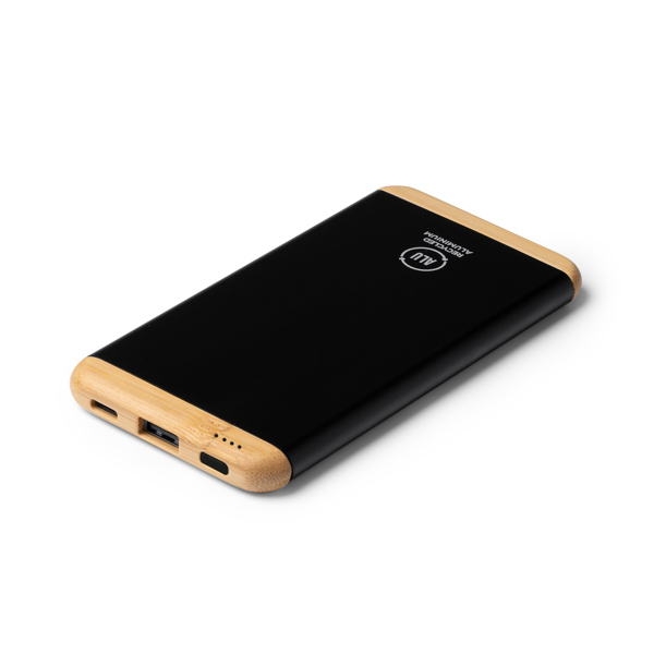 Batería externa de 5.000 mAh elaborada en cuerpo de aluminio reciclado y detalles en bambú. Puerto de entrada Tipo C y puerto de salida USB. Cuenta con indicador luminoso de carga.