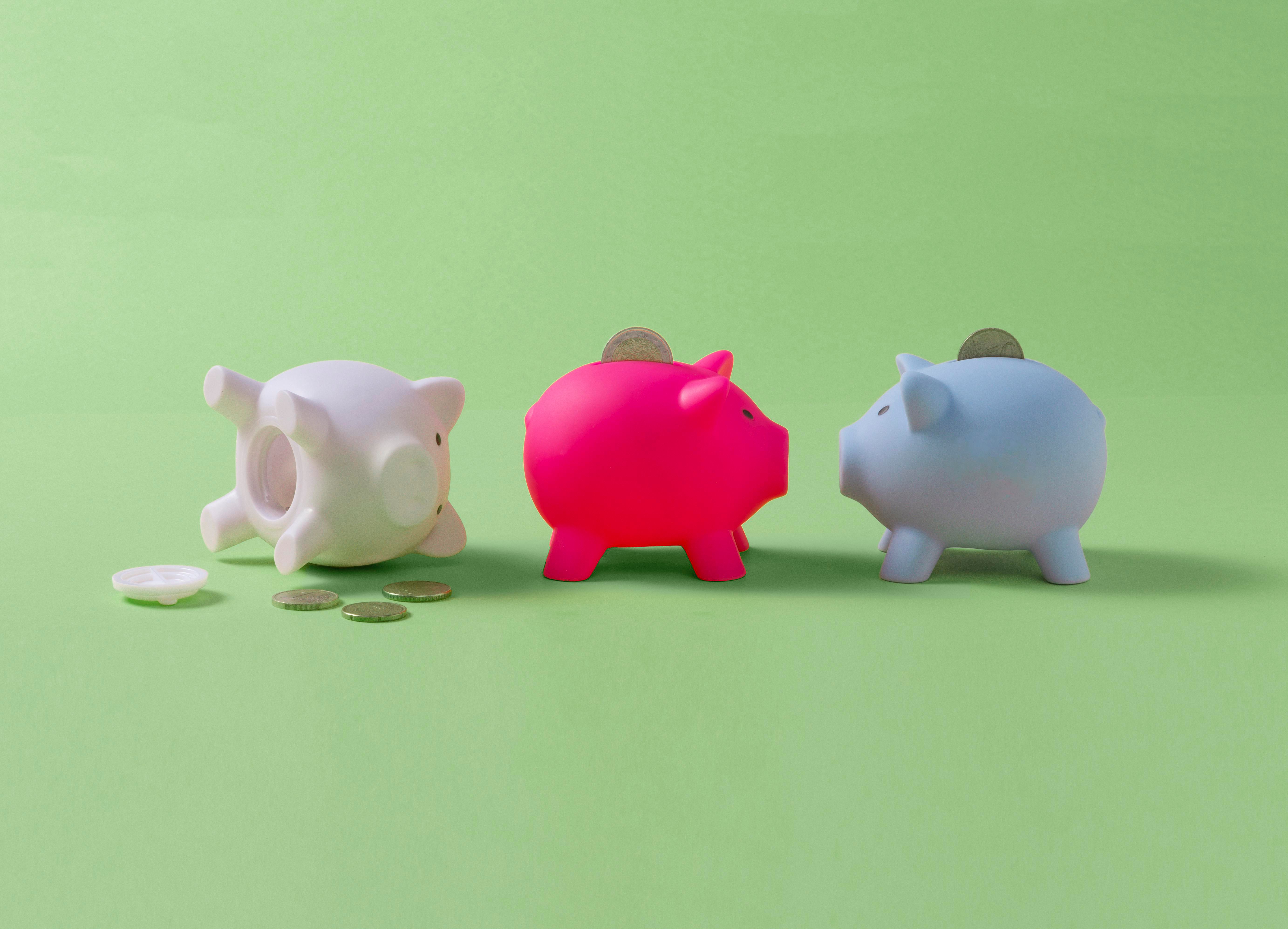 Hucha de plástico en forma de cerdito y un tapón en la parte inferior.