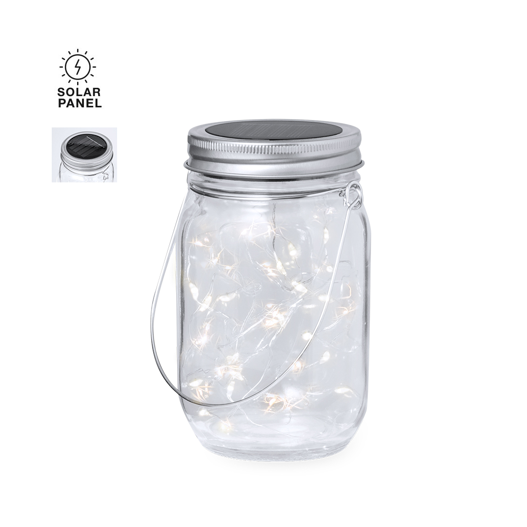 Original lámpara tarro solar, fabricada en resistente material cristal y con una tira interior decorativa de 20 LEDs. Incluye tapadera a rosca metálica con minipanel solar de recarga integrado y una batería recargable de 300 mAh. Con práctica asa para transportar o colgar, y presentada en caja individual de diseño kraft.